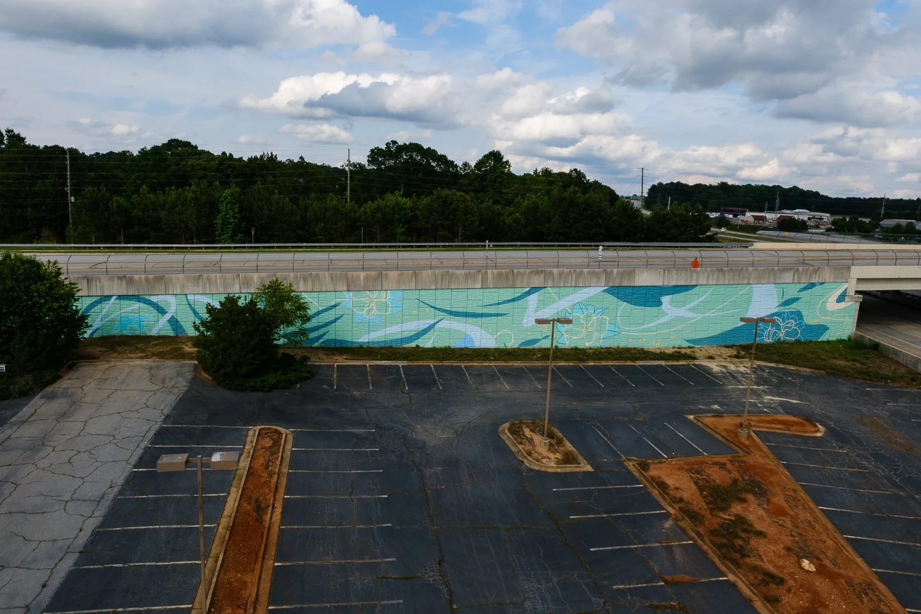 “Magnolias on a Sweet Breeze” is about the calming yet invigorating quality of carefully observing nature and taking in the present moment. Inspired by the multifunctional appeal of Lawrenceville’s parks — places designed for movement & meditation where communities come together. In a limited color palette of greens and blues, this design adds color to the heavily cemented lot near Georgia Gwinnett College. This project was completed with the assistance of the local community, GGC students, with over 170 participants coming together to paint.